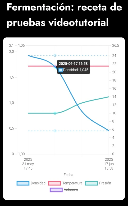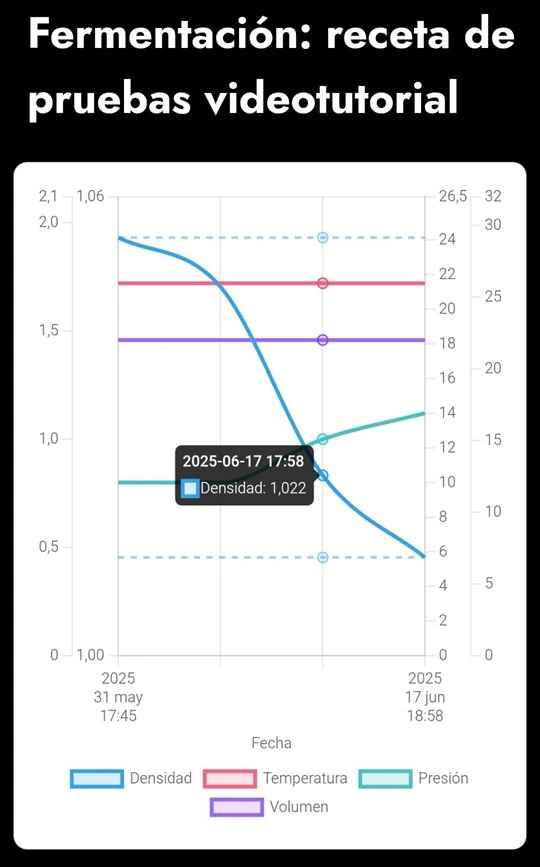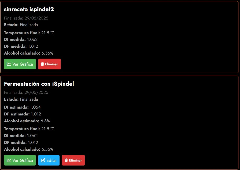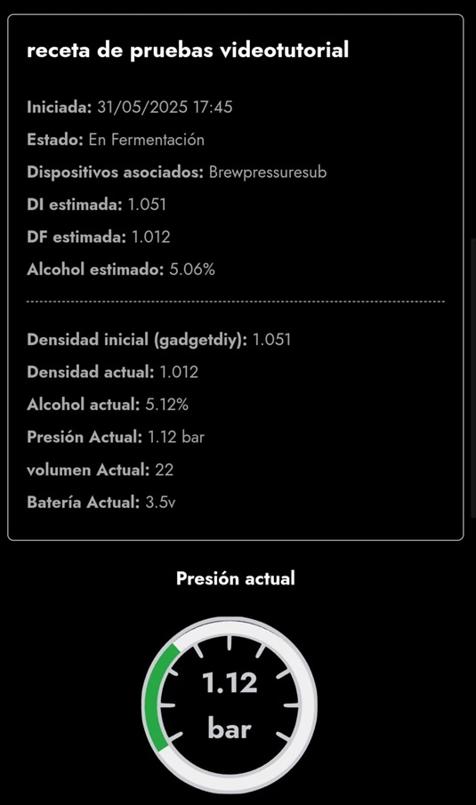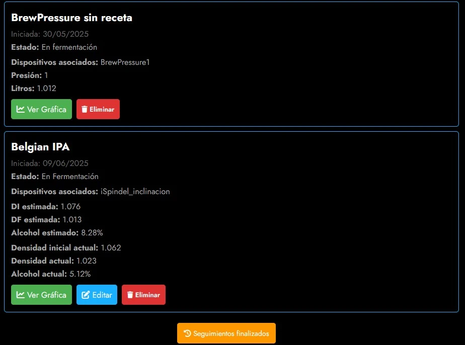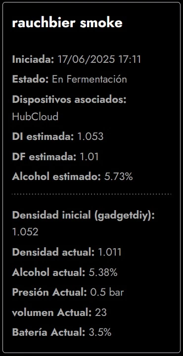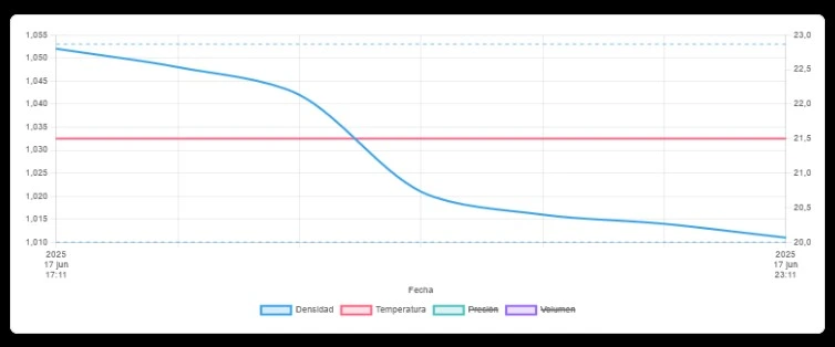 - Si es sin receta, en el menú principal de mis fermentaciones te aparecerá el último dato recibido de esa receta, el día que comenzó y el dispositivo asociado.