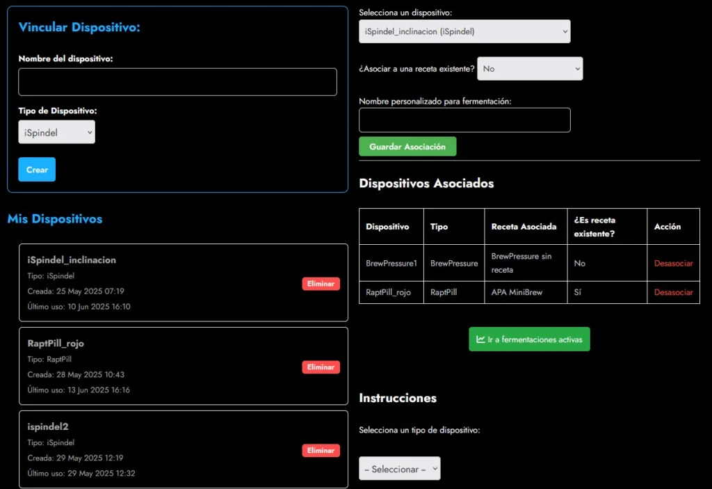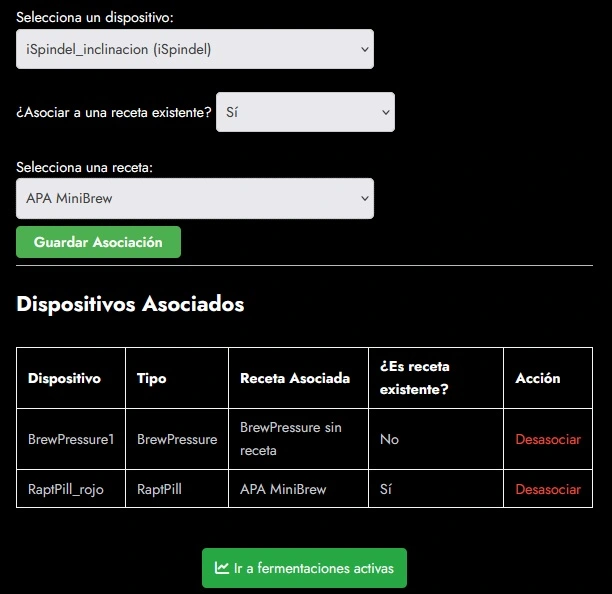 Donde podremos crear los dispositivos con su «clave de integración asociada», tendremos un registro de la última vez que se uso* y podremos vincular el dispositivo a una receta ya existente o crear una fermentación sin receta para empezar a obtener los datos.