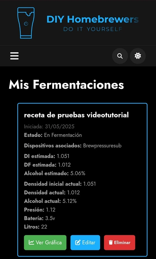 Para ver todos tus datos desde fuera de casa, recordarte que DIYHOMEBREWERS se está adaptando para que puedas ver toda la información desde el móvil, desde luego desde el PC es la forma más completa y sencilla pero puedes realizar un seguimiento de tus fermentaciones perfectamente desde un movil:
