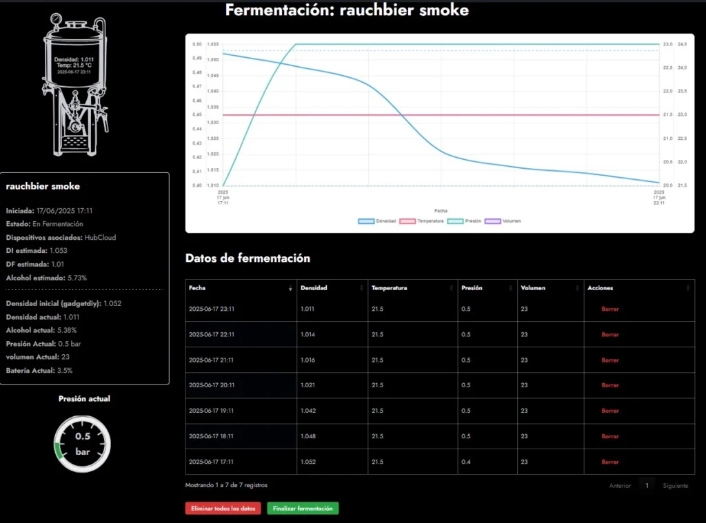 Tendremos los datos en formato tabla, de forma que también podemos borrar manualmente algún dato recibido erróneamente o incluso todos los datos de vez y que vuelva a recibir nuevos datos «reiniciando la fermentación».